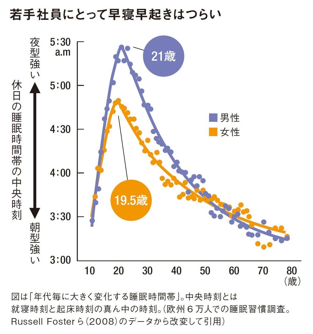 個人差に加えて年齢差も考慮したほうがいいでしょう。一生の間で体内時計がもっとも遅れるのは、男性21歳、女性19.5歳です。その年齢をピークにして体内時計は年々早まっていき、必要な睡眠時間も短くなっていきます。50~60代の中高年には苦でない早朝出勤も、若い社員にとっては大変なのです。