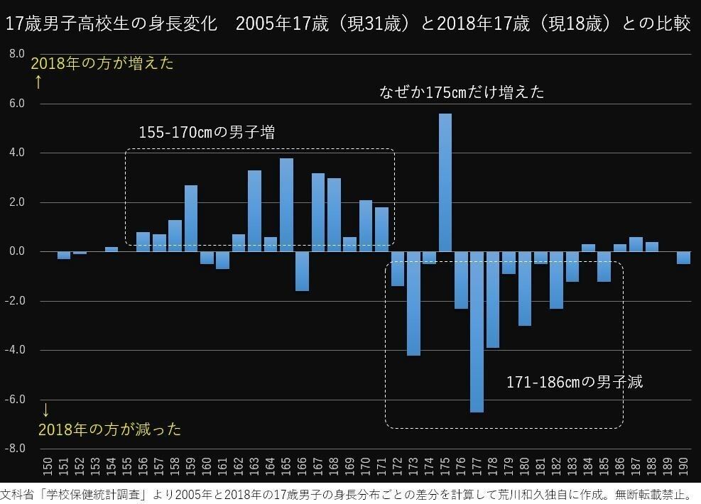 明らかに、2018年の17歳の方が2005年の17歳より身長が低くなっていることがわかります。具体的には、155-170㎝台の身長が増え、171-186㎝台の身長が減っています。