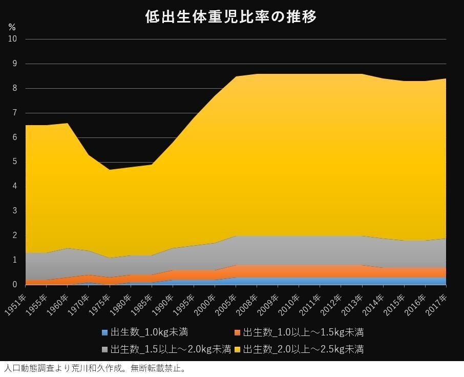 とはいえ、全体に占める構成比は1割にも満たないではないか、というご意見もあるかと思いますが、低出生体重児ではない、2.5-3.0kgの子まで含めると、1975年の27%から2017年43%まで1.6倍に増えています。明らかに、出生児の体重は減ってきていることがわかります。