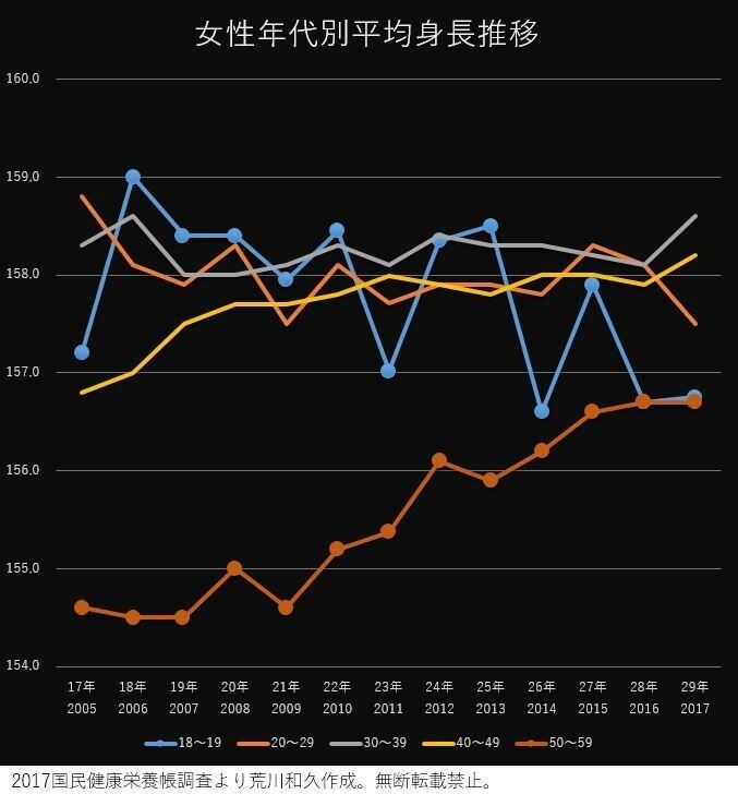厚労省「国民健康・栄養調査」のデータを基に、2005年以降の年代別平均身長の推移がこちらです。