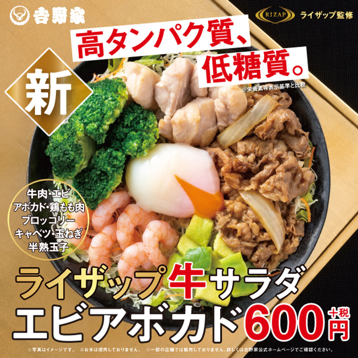 同商品は、牛肉、エビ、鶏もも肉、ブロッコリー、キャベツ、玉ねぎ、半熟玉子が入った、ライザップ公認の”高タンパク質・低糖質”メニュー。エビとアボカドは吉野家全店で販売するメニューとして初めて使用する。